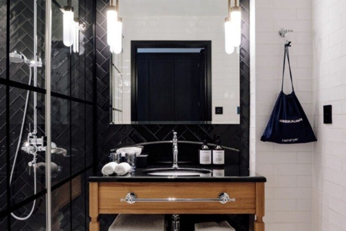 Spacious and elegant, the Fortuna Suite features separate seating area, high ceilings, large windows, and parquet floors. Some suites include a balcony overlooking Haven. Many preserves original 1919 details, blending heritage with modern comfort. Bathrooms showcase elegant mosaic tiles, while designer lighting by Birger Dahl and Hadeland Glassverk creates a warm, inviting atmosphere.