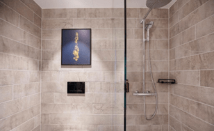 Standard Rooms combine comfort and style, featuring high ceilings, parquet floors, and luxurious beds. Bathrooms showcase elegant mosaic tiles and exclusive Sprekenhus products. Designer lighting by Birger Dahl and Hadeland Glassverk, along with historic Amerikalinjen details, create a warm and distinctive atmosphere.