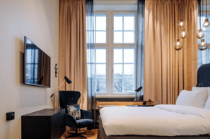 Spacious deluxe double rooms (30-40 sqm) have everything you might need. All the rooms feature a queen size double bed (160cm) with large pillows for added comfort, and we can provide an extra bed if required. Deluxe double rooms feature high-tech equipment including smart TVs with a streaming function and a convenient workspace with desk or a lounge area. All the rooms have bathroom with a hairdryer, bathrobes, slippers, and shower or bathtub. Some of the rooms have a balcony or terrace.