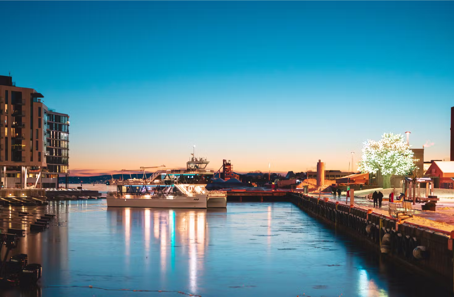 Step aboard a modern fully electric vessel Brim Explorer and enjoy a quiet evening cruise on the Oslo Fjord while savoring a seasonal three-course dinner prepared by the chefs of Einer restaurant. As you glide silently past the city’s waterfront landmarks, take in panoramic views through large windows and spacious decks.